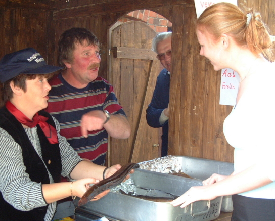 Vom Grill zu den rustikalen Holzbänken, am Fischstand vorbei,