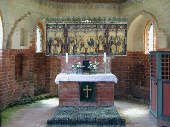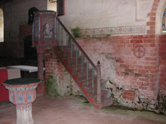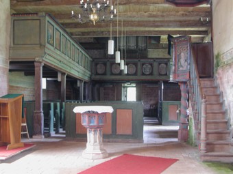 Blick vom Chor ins Schiff. Empore, Kanzel, Taufbecken